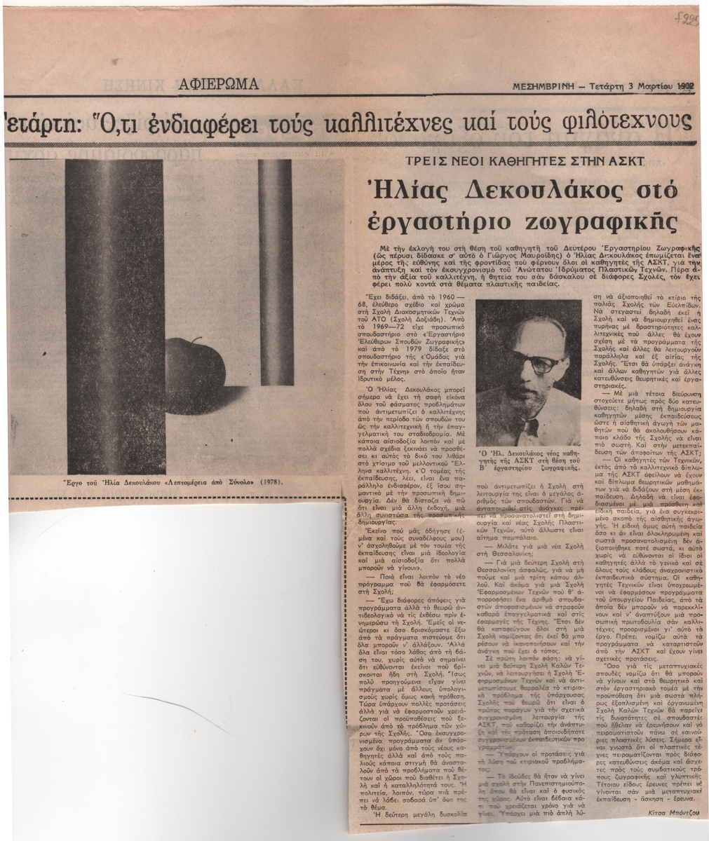 Spiteri-Veropoulou Ioanna (1920 - 2000) ; Giorgos Touyas (1922 - 1994) ; Sotiris Sorogas (1936) ; Moralis Yannis (1916 - 2009) ; Michalis Katzourakis ; Eleni Zongolopoulou (1909 - 1993) ; Simossi Gabriela (1926 - 1999) ; Dimitris Constantinou (1924 - 2010) ; Opy Zouni (1941 - 2008) ; Zongopoulos Giorgos (1903 - 2004) ; (Panagopoulos) Daniel (1924 - 2008) ; Ilias Dekoulakos (1929 - 1998) ; Karas Christos (1930 - 2023) ; Vernadaki Eleni (1933) ; Kampouridis Charis (1950) ; Apergis Antonis (1938 - 2018) ; Panayiotis Gravalos (1933 - 2015) ; Achilleas Droungas (1940) ; Niki Kanagini (1933 - 2008) ; Kostas Karachalios (1923 - 2007) ; Καίτη Αντύπα (1925 - 2006) ; Kessanlis Nikos (1930 - 2004) ; Dimitris Kontos (1931 - 1996) ; Eirini Apergi (1921 - 1994) ; Loucopoulos, Clearchos (1906 - 1995) ; Nausica Pastra (1921 - 2011) ; Κώστας Βαρώτσος (1955)