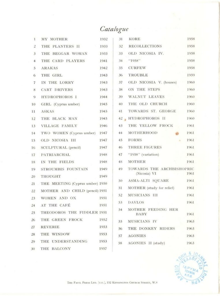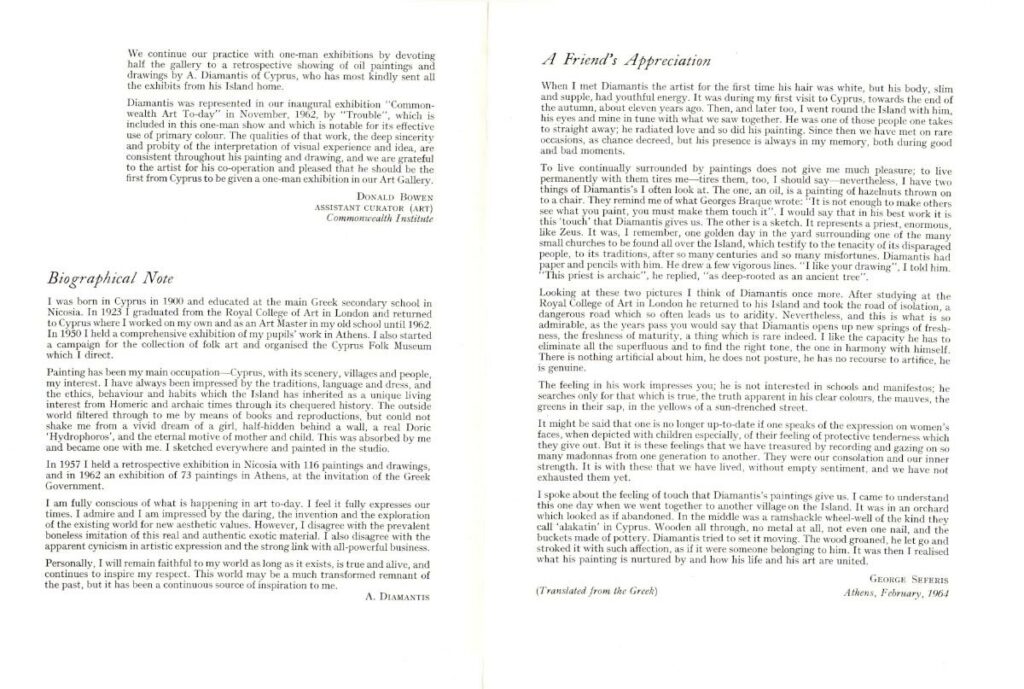 A pamphlet for a solo exhibition of paintings by Diamantis Diamantis, held in London. It includes an introduction by the curator, a biographical note on the artist, a text by Giorgos Seferis titled “A Friend’s Appreciation,” written in February 1964, and a catalog of works.