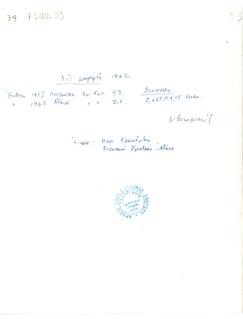 Black-and-white printed photograph of a work by Diamantis Diamantis. On the reverse, inscriptions.
