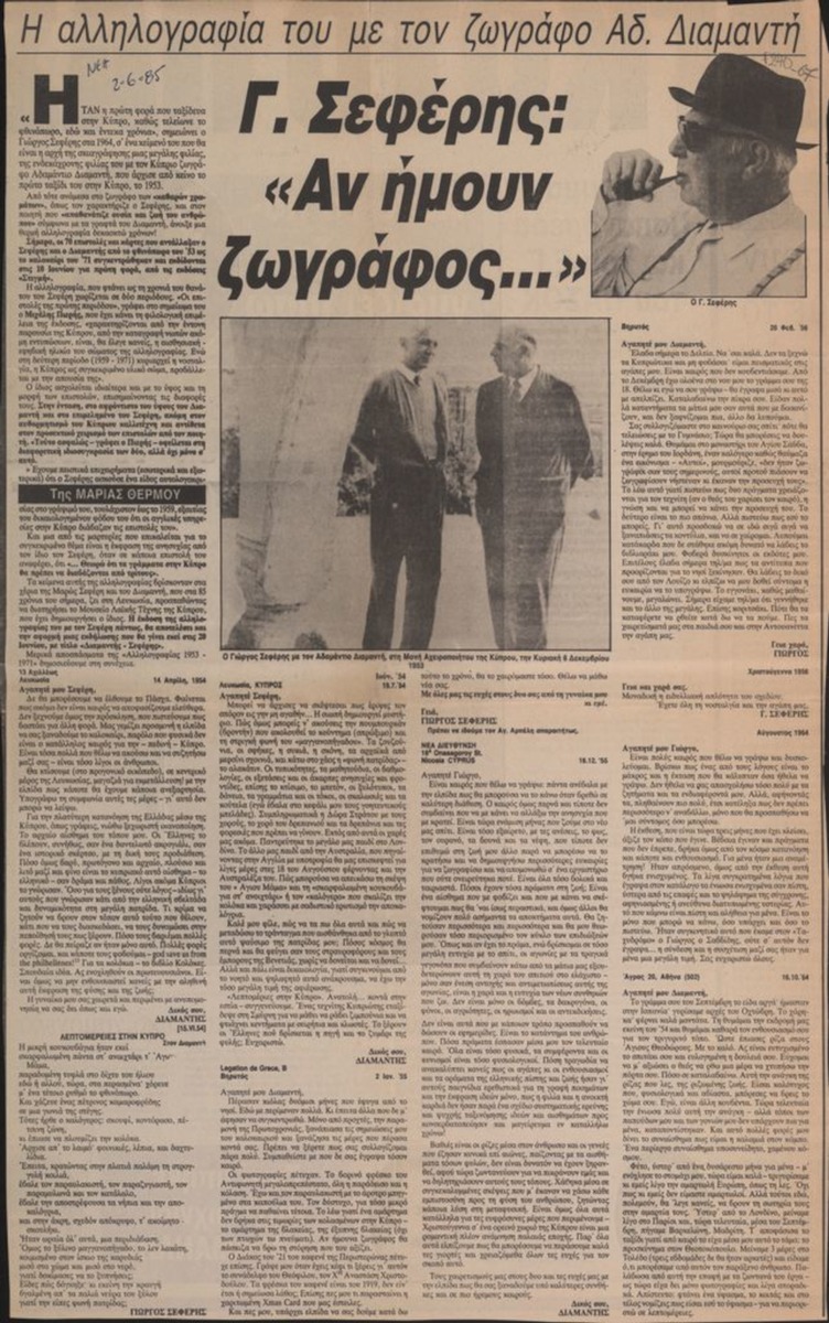 A clipping from the newspaper “Ta Nea”, dated June 2, 1985, featuring an article about the correspondence between Greek poet Giorgos Seferis and painter Diamantis Diamantis. The article includes excerpts from their correspondence spanning the period from 1954 to 1964