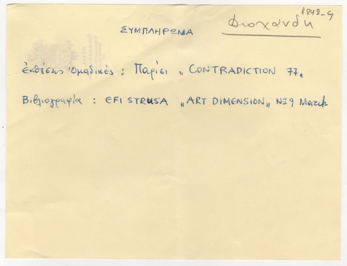 Spiteri-Veropoulou Ioanna (1920 - 2000) ; Sotiris Sorogas (1936) ; Diochanti (1945) ; Michalis Katzourakis ; Vernadaki Eleni (1933) ; Panayiotis Gravalos (1933 - 2015) ; Niki Kanagini (1933 - 2008) ; Kessanlis Nikos (1930 - 2004) ; Dimitris Kontos (1931 - 1996) ; Michas Yannis (1938 - 2008) ; Nikolaidis Giorgos (1924 - 2001) ; Λήδα Παπακωνσταντίνου-Hughes (1945) ; Χρήστος Καρράς