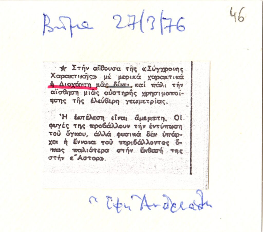 Spiteri-Veropoulou Ioanna (1920 - 2000) ; Andreadi Efi (20th century) ; Touyas Giorgos (1922 - 1994) ; Sotiris Sorogas (1936) ; Diochanti (1945) ; Romanos Chryssa (1931 - 2006) ; Zongopoulos Giorgos (1903 - 2004) ; Achilleas Aperghis (1909 - 1986) ; Xagoraris Pandelis (1929 - 2000) ; Ilias Dekoulakos (1929 - 1998) ; Vernadaki Eleni (1933) ; Niki Kanagini (1933 - 2008) ; Kessanlis Nikos (1930 - 2004) ; Loucopoulos, Clearchos (1906 - 1995) ; Bouteas Yannis (1941 - 2026) ; Bia Davou (1932 - 1996)