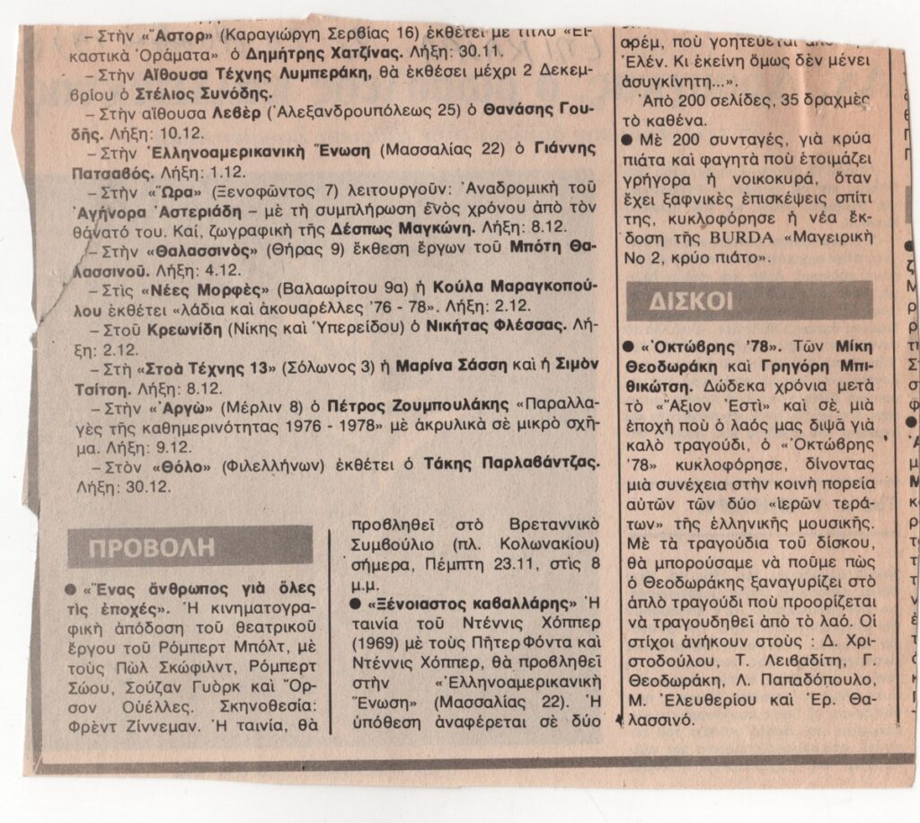 Theodorakis Mikis (1925 - 2021) ; Petassi Eleni (20th century) ; Merkouri Melina (1920 - 1994) ; Ritsos Giannis (1909 - 1990) ; Argyrakis Minos (1920 - 1998) ; Wolfgang Amadeus Mozart (1756 - 1791) ; Xenakis Iannis (1922 - 2001) ; Takis (Vassilakis Panayiotis) (1925 - 2019) ; Αργύρης Κουνάδης (1924 - 2001) ; Kollatos Dimitris (1937 - 2025) ; Kyriakoulis Antonis (1938) ; Hatzidakis Manos (1925 - 1994) ; Βαγγέλης Παπαθανασίου ; Τζένη Βάνου (1936 - 2014)