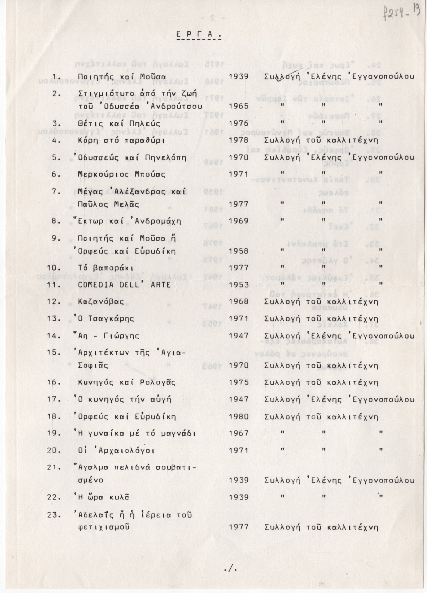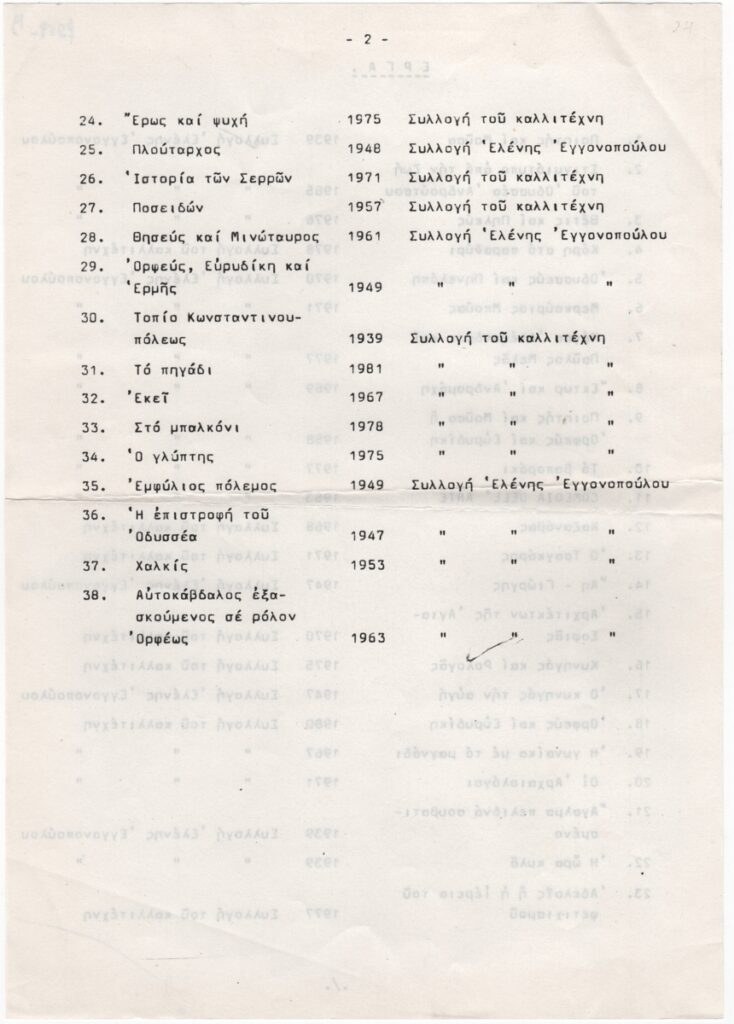 Nikos Engonopoulos (1907 - 1985) ; Semertzidis Valias (1911 - 1983) ; Spiteri-Veropoulou Ioanna (1920 - 2000) ; Vassiliou Spyros (1902 - 1985) ; Hatzikyriakos-Ghika Nikos (1906 - 1994) ; Raftopoulou Bella (1902 - 1992) ; Sikeliotis Giorgos (1917 - 1984) ; Iliopoulou-Rogan Dora (20th century) ; Gaitis Yannis (1923 - 1984) ; Mytaras Dimitris (1934 - 2017) ; Tetsis Panagiotis (1925 - 2016) ; Panayiotis Gravalos (1933 - 2015) ; Konstantinos Grammatopoulos (1916 - 2003) ; Varlamos Giorgos (1922 - 2013) ; Katsoulidis Takis (1933) ; Μάριος Λοβέρδος ; Malamos Kostas (1913) ; Manousakis Giorgos (1914 - 2003) ; Georgios Mavroidis (1912 - 2003) ; Malamou-Mitsea Ioanna (1913 - 2004) ; Preka-Stefanatou Meropi (1934 - 2025) ; Prekas Paris (1926 - 1999) ; Ευάγγελος Τερζόπουλος ; Iris Drakouli (1929)