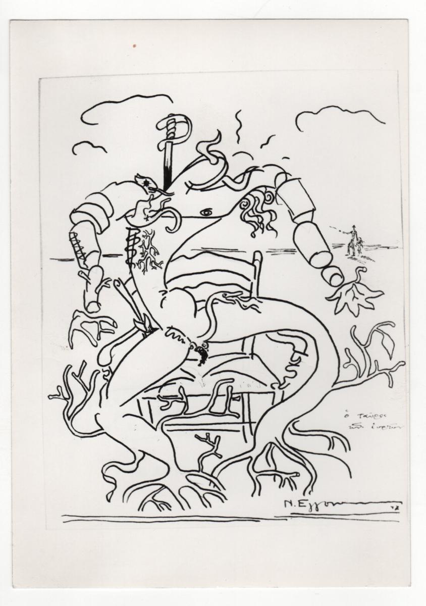 Black-and-white printed photograph of a work by Nikos Engonopoulos. On the reverse, photographers stamp.