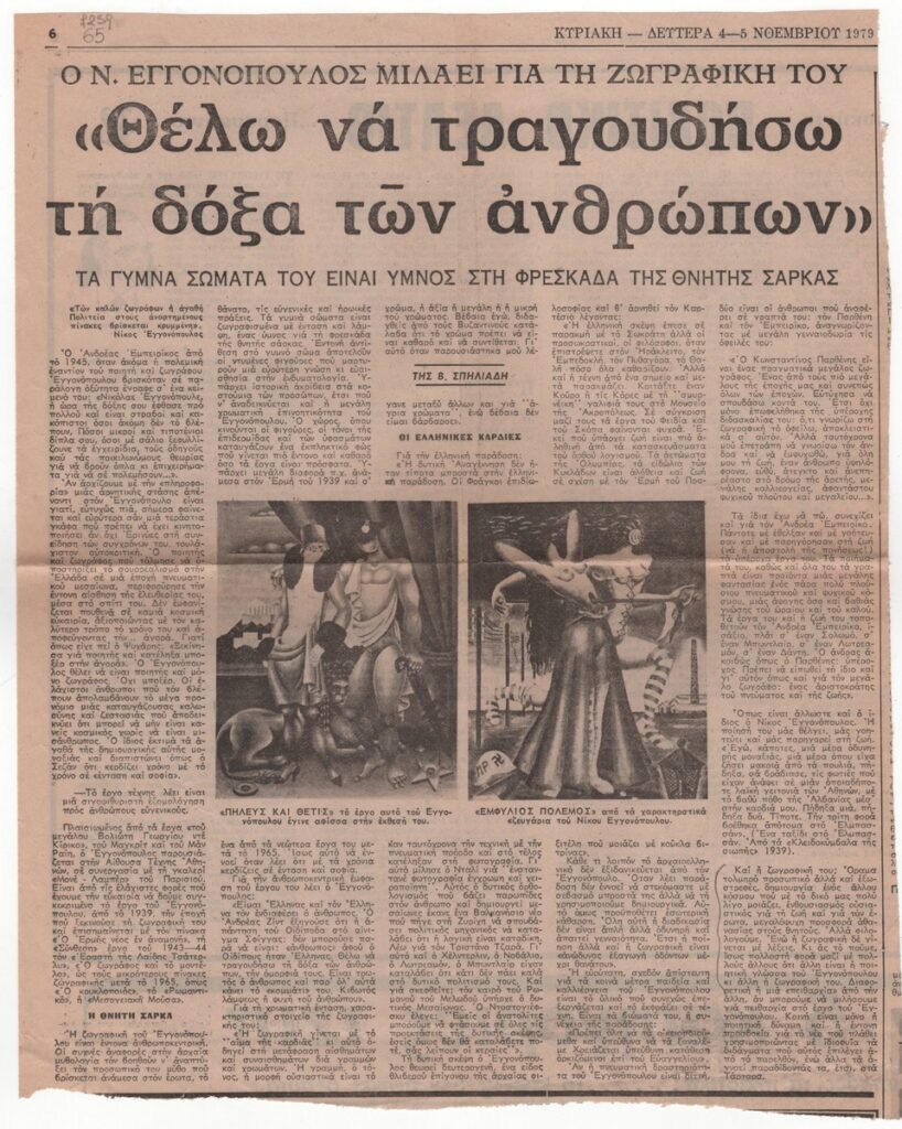 A newspaper clipping, dated November 4, 1979, featuring an article by B. Spiliadis about the artist’s work, including excerpts from an interview.