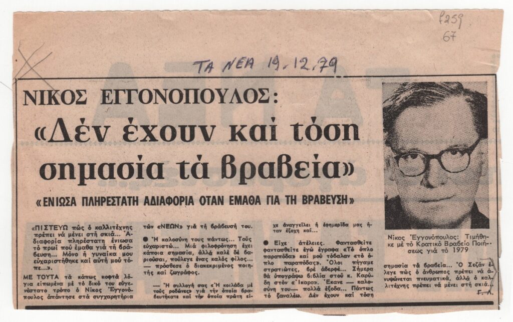 A clipping from the newspaper “Ta Nea”, dated December 19, 1979, featuring an interview with the artist on the occasion of receiving the 1st State Poetry Prize.