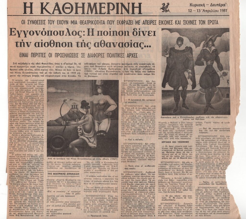 A clipping from the magazine “I Kathimerini”, dated April, 12, 1981, , featuring an interview with the Greek poet and painter Nikos Engonopoulos on the occasion of the artist’s retrospective exhibition in Athens.