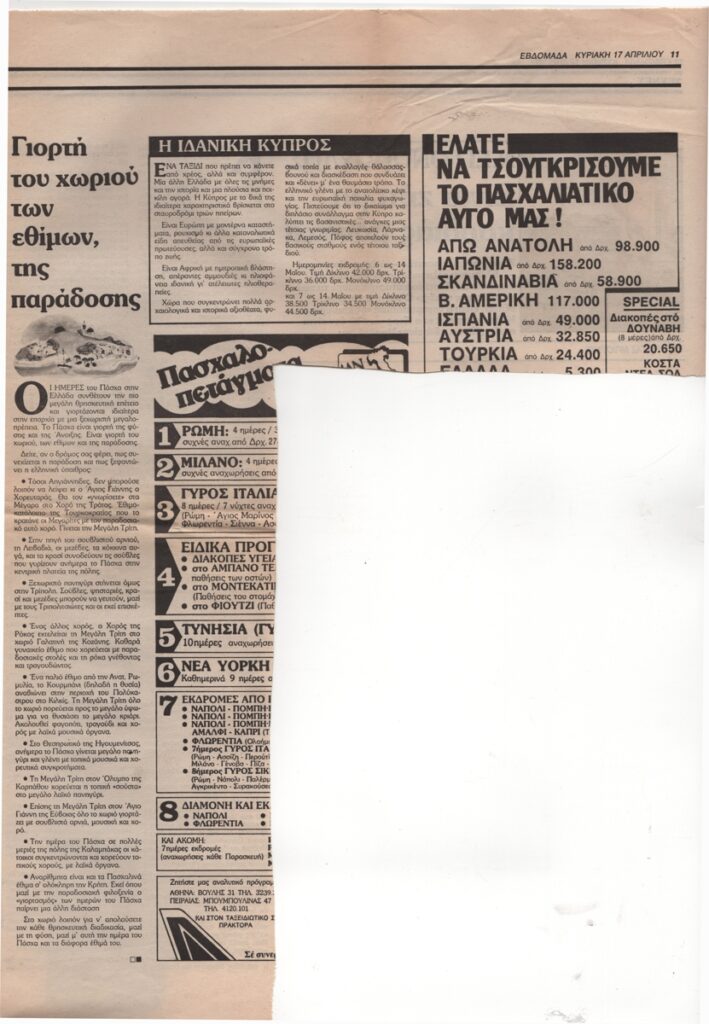 A clipping from the newspaper “Evdomada”, dated April 17, 1983, featuring an interview with N. Engonopoulos about his art, his relationship with Hellenism, politics, and his exhibition at the National Gallery.
