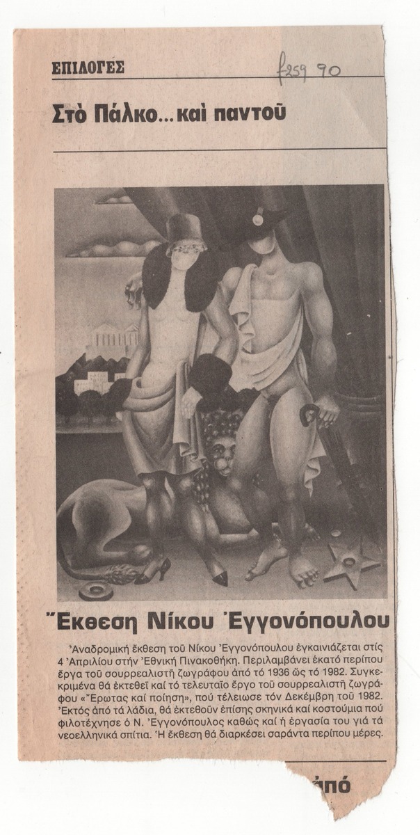 A newspaper clipping, dated November, 1983, featuring an announcement of Nikos Engonopoulos’ retrospective exhibition at the National Gallery, showcasing works from the period 1932-1982.