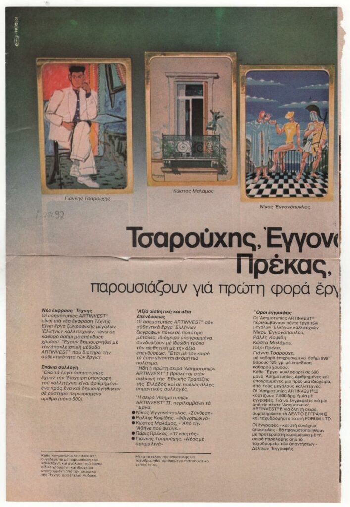 A clipping from the magazine “O Taxydromos”, featuring an advertisement of ARTINVEST silver prints with paintings by great Greek artists. Works by Tsarouchis, Engonopoulos, Malamos, Kopsidis and Prekas are reproduced.