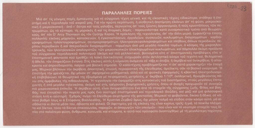 Spiteri-Veropoulou Ioanna (1920 - 2000) ; Moralis Yannis (1916 - 2009) ; Yannis Grammatikopoulos (1928) ; Christina Zervou (1937 - 1988) ; Mytaras Dimitris (1934 - 2017) ; Theodoros (Papadimitriou) (1931 - 2018) ; Karas Christos (1930 - 2023) ; Victor Vasarely ; Achilleas Droungas (1940) ; Τρύφων Καζάκος (1895 - 1966)
