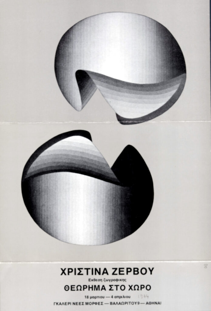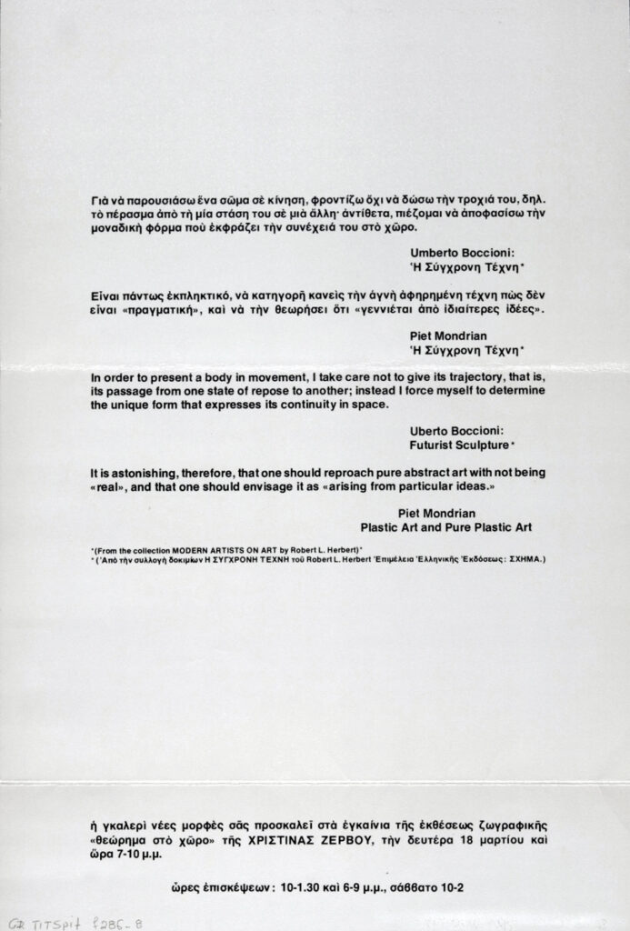 Poster and invitation to Christina Zervos’ solo exhibition in Athens.. It includes excerpts from texts by P. Mondrian and U. Boccioni.