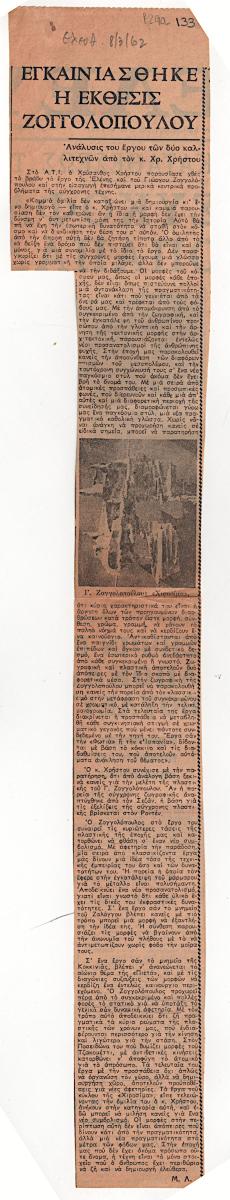 A newspaper clipping, dated March 8, 1962, featuring an article about the group exhibition by Giorgos and Eleni Zongolopoulos in Athens.