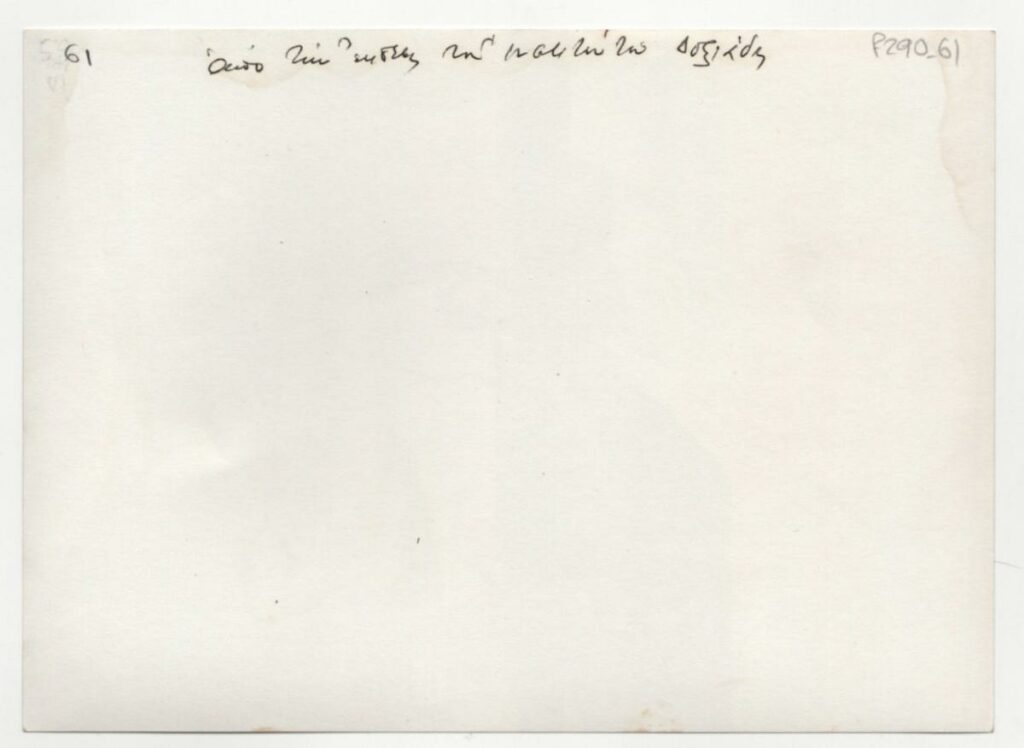 Black-and-white printed photograph of an outdoor space from an exhibition of G. Zogolopoulos at the Doxiadis Institute in Athens. On the reverse, inscription.