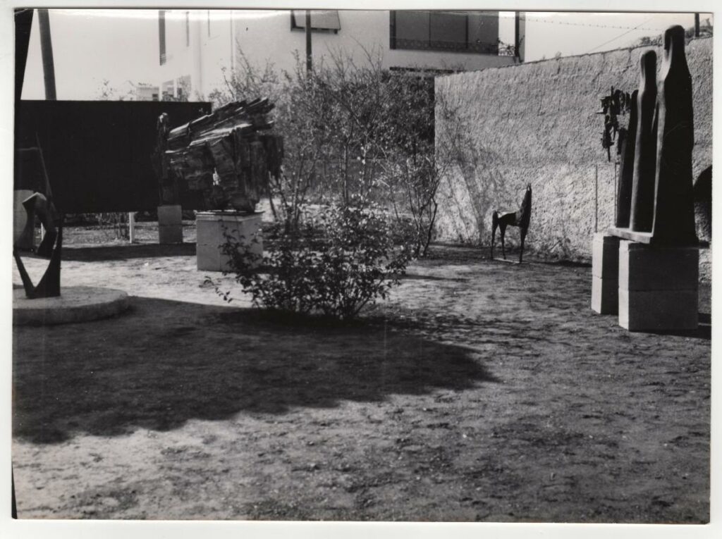 Black-and-white printed photograph of a view of an outdoor exhibition of works. Among them, the work “Mycenae” by Giorgos Zogolopoulos is visible.