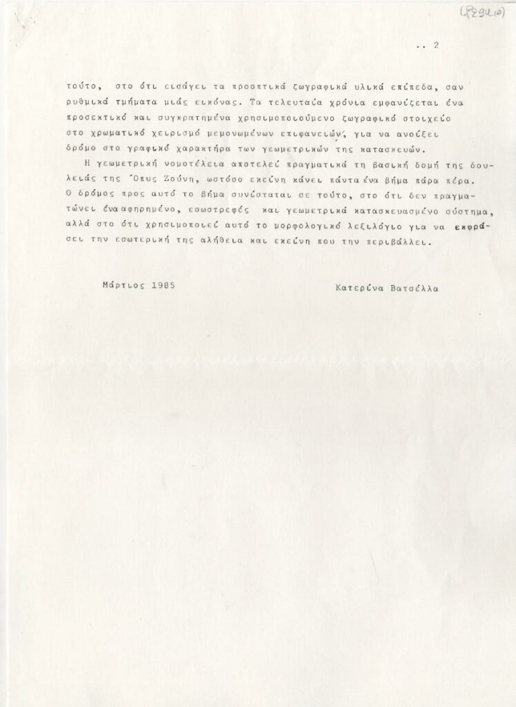 Typewritten text about the Greek artist Opy Zouni. The text includes biographical information and disscusses various aspects of her work.