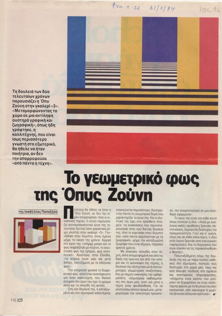 A clipping from the magazine “Ena”, issue 22, dated May 31, 1984, featuring a critical review of Opy Zouni’s exhibition is published, which took place at Gallery 3 in Athens.