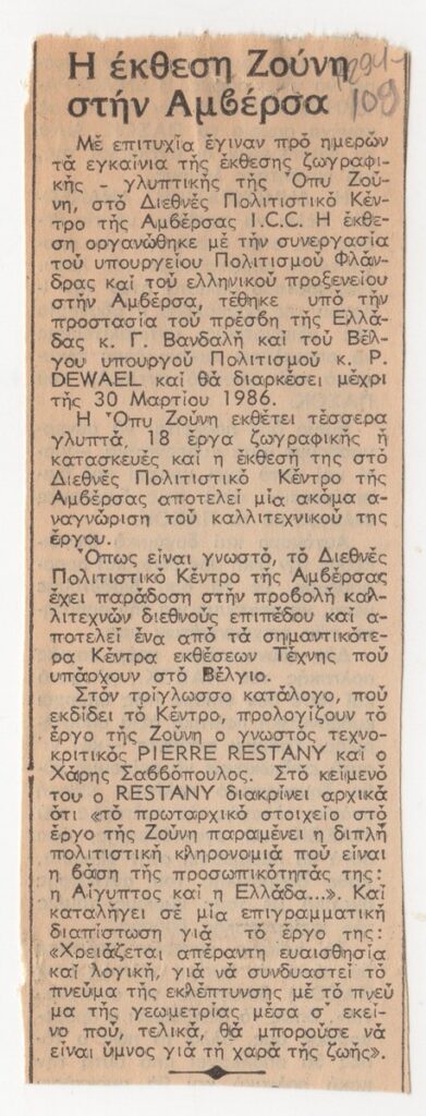 A newspaper clipping, featuring a review of the exhibition by the Greek artist Opy Zouni, held in Antwerp.