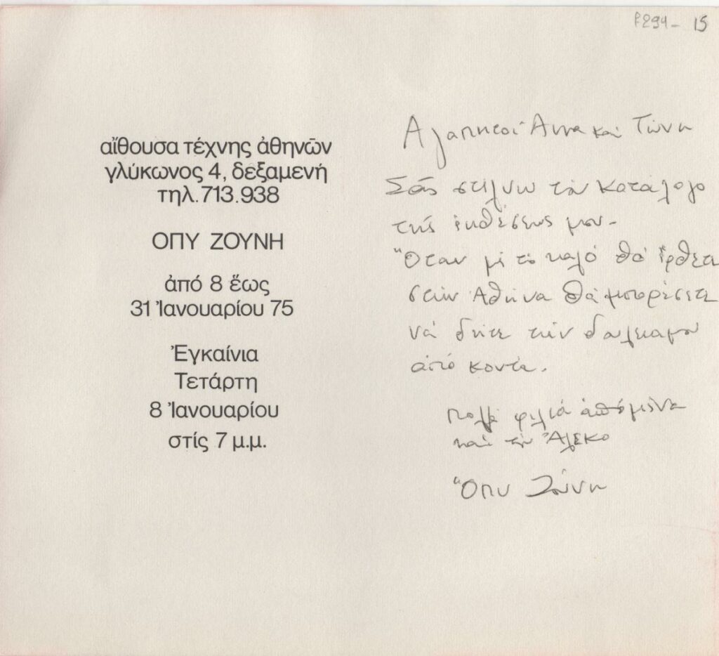 Invitation to Opy Zouni’s solo exhibition at the Athens Art Gallery in 1975, featuring a letter from Opy Zouni to Tonis and Ioanna Spiteri.