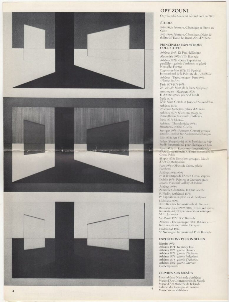 Publication featuring a text titled “Constructions and outdoor environment with movable elements’, about the visual work of Opy Zouni. It contains biographical note and illustration.