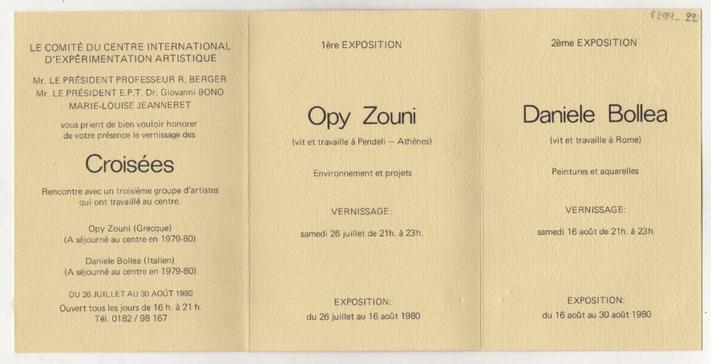 Pamphlet for the exhibition titled Croisées, organized by the Center International d” Expérimentation Artistique in Boissano, Italy. The exhibition features two solo shows by Opy Zouni and Daniele Bollea.