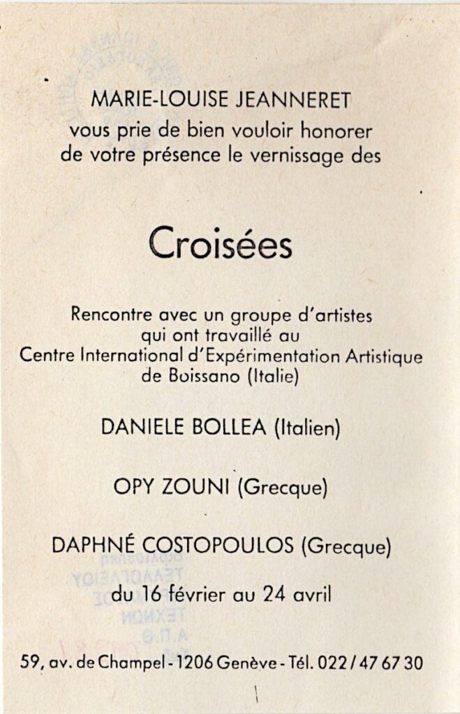 Photocopy of an invitation to a solo exhibition by Opy Zouni, as part of the event “Croisées’, in which Daniele Bollea and Daphné Costopoulos also participate with their exhibitions, at the Marie-Louise Jeanneret Gallery in Geneva.