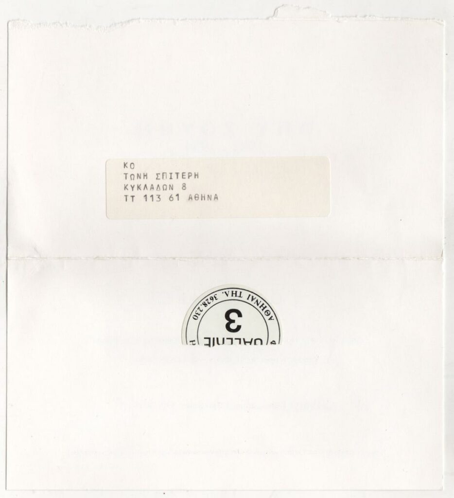 Invitation to a solo exhibition by Opy Zouni, at the Galerie 3 in Athens, addressed to Tonis Spiteris.
