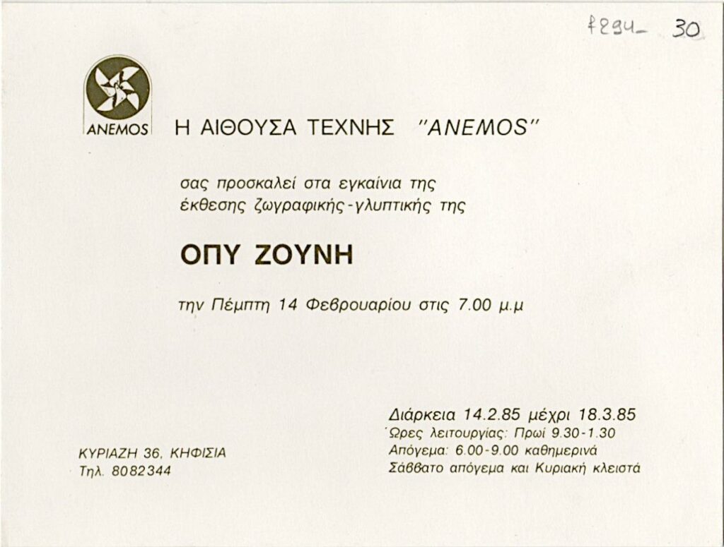 Invitation to a solo exhibition by Opy Zouni, at the Anemos Art Gallery in Athens.