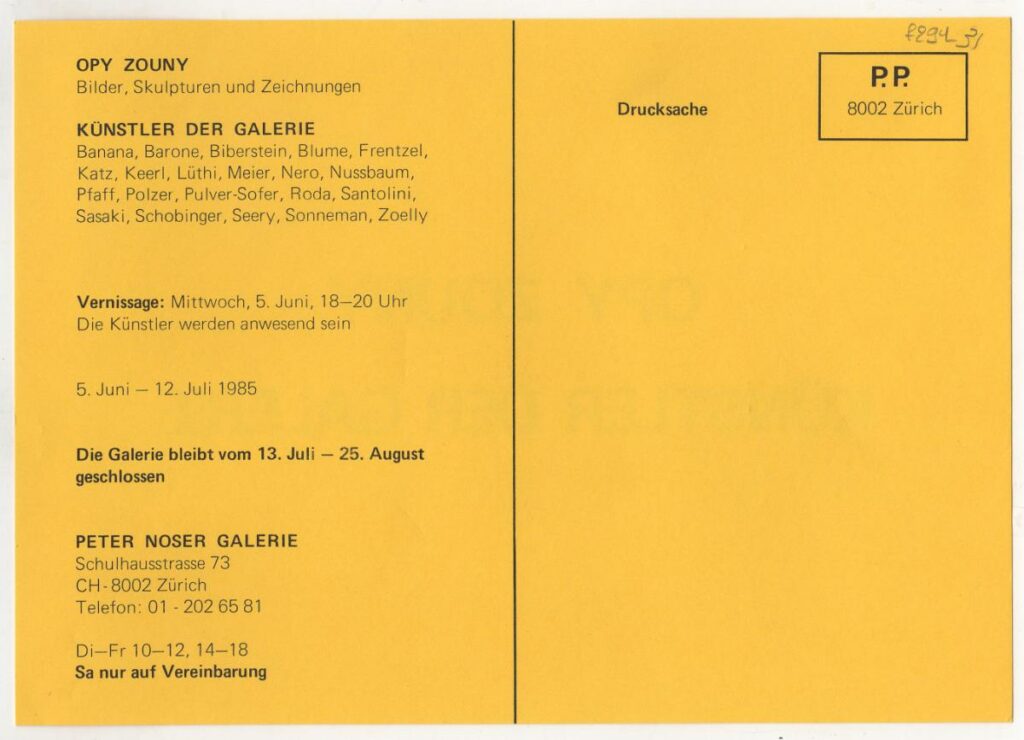 Invitation to a solo exhibition by Opy Zouni at Peter Noser Galerie in Zurich.