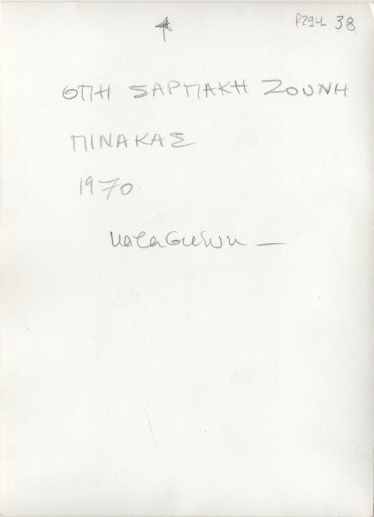 Black-and-white printed photograph of an artwork by Opy Zouni. On the reverse, inscription.