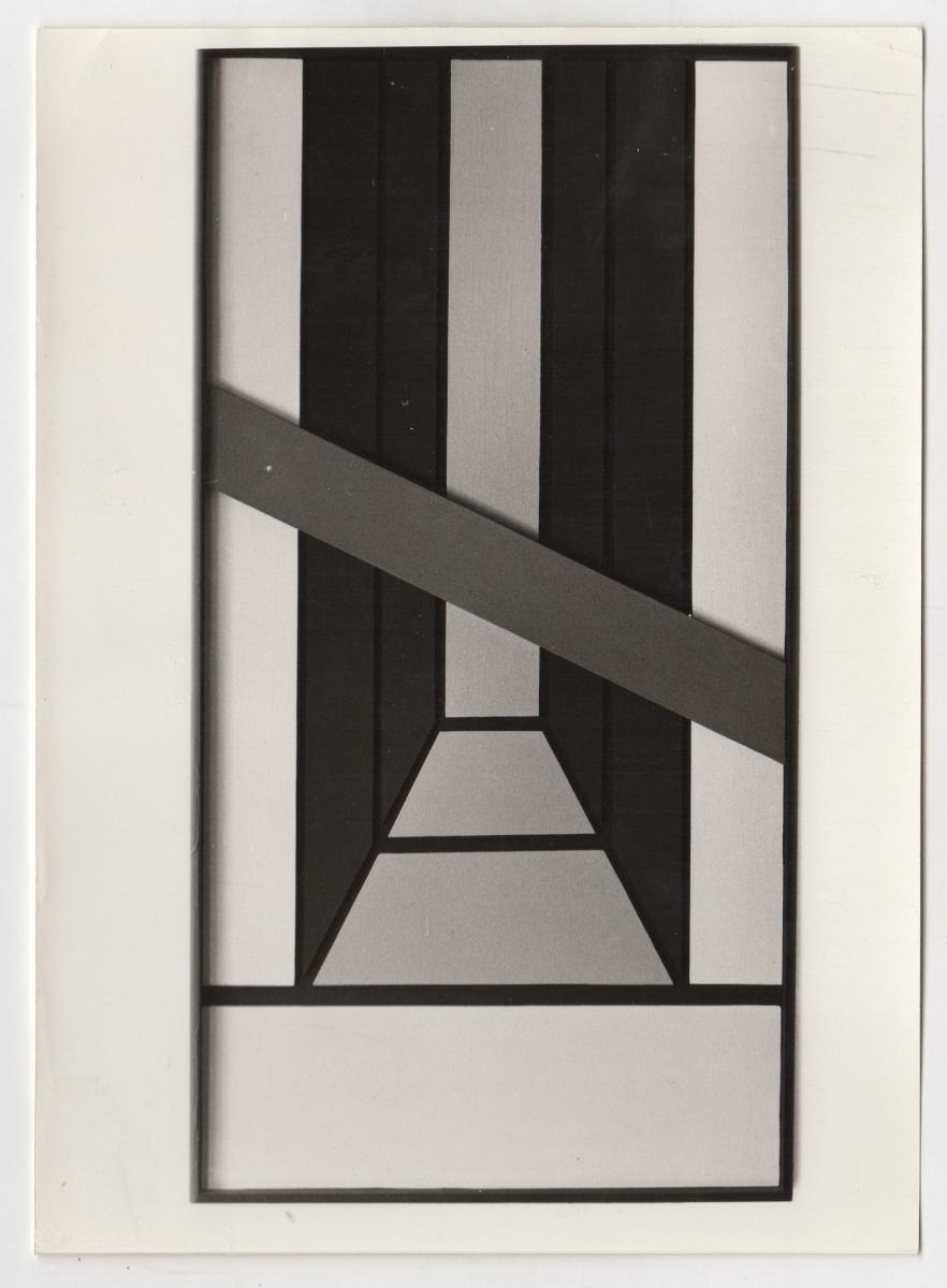 Black-and-white printed photograph of an artwork by Opy Zouni. On the reverse, inscription.