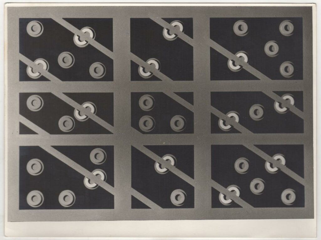 Black-and-white printed photograph of an artwork by Opy Zouni. On the reverse, inscription.