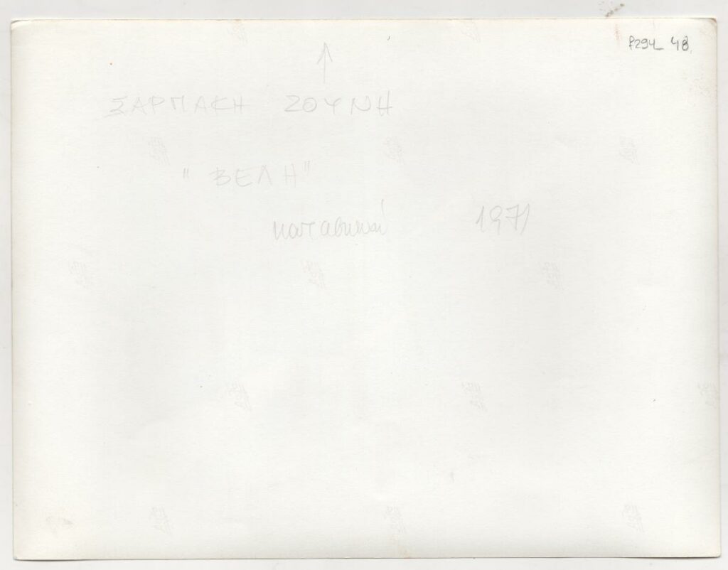 Black-and-white printed photograph of an artwork by Opy Zouni. On the reverse, inscription.