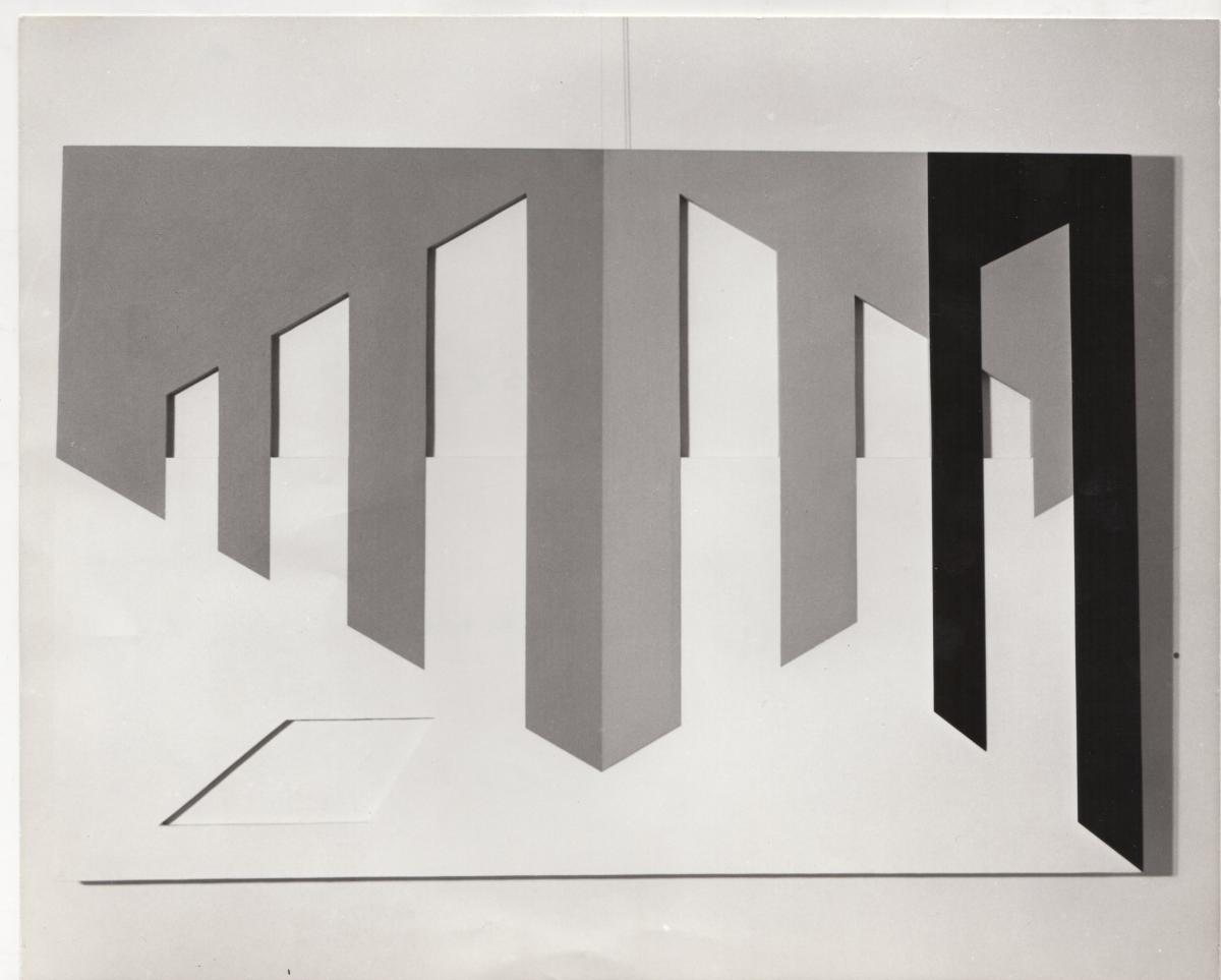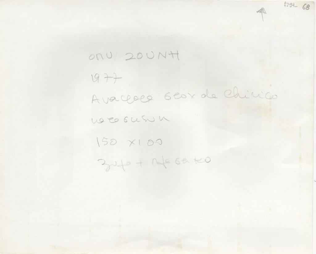Black-and-white printed photograph of an artwork by Opy Zouni. On the reverse, inscription.