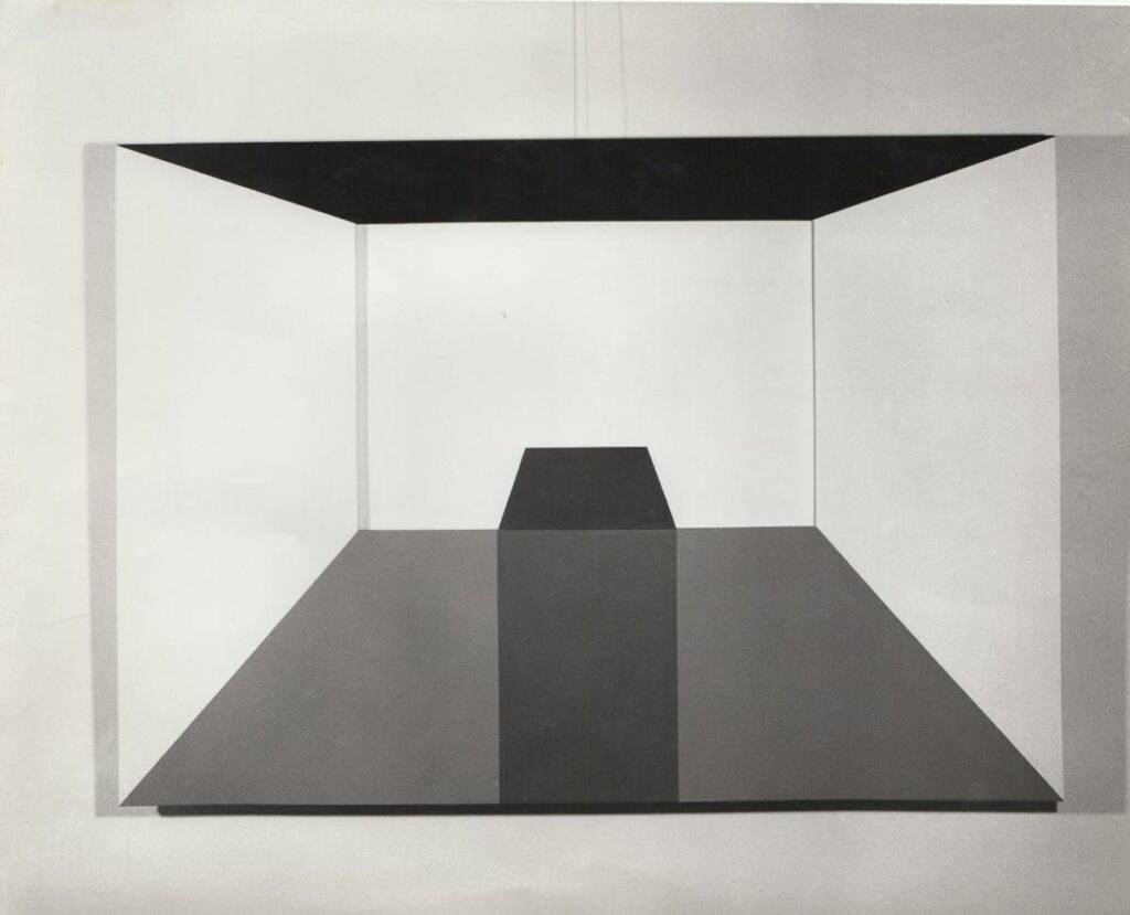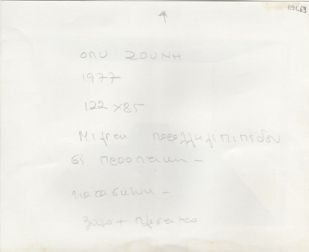 Black-and-white printed photograph of an artwork by Opy Zouni. On the reverse, inscription.