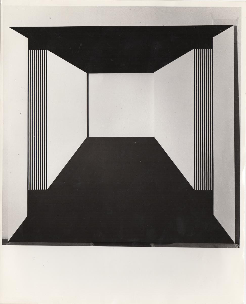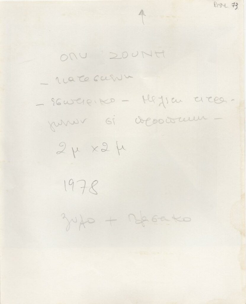 Black-and-white printed photograph of an artwork by Opy Zouni. On the reverse, inscription.