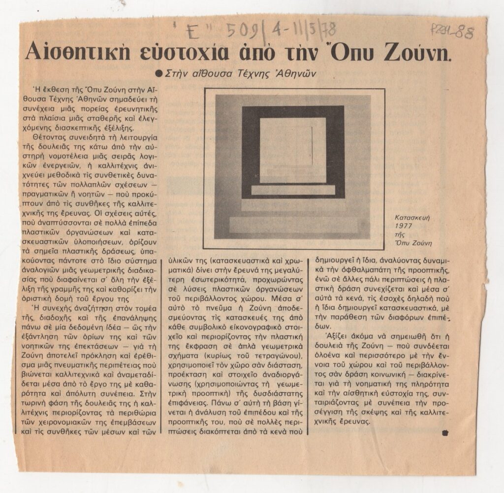 A clipping from the magazine “Epikara”, dated May 4, 1978, featuring a review of the exhibition by Opy Zouni, at the Athens Art Gallery.
