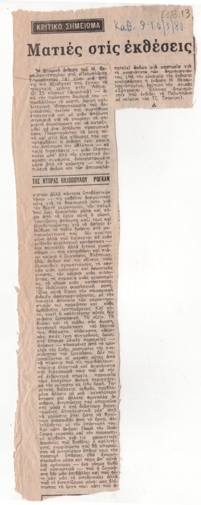 Nikos Engonopoulos (1907 - 1985) ; Semertzidis Valias (1911 - 1983) ; Spiteri-Veropoulou Ioanna (1920 - 2000) ; Vassiliou Spyros (1902 - 1985) ; Hatzikyriakos-Ghika Nikos (1906 - 1994) ; Raftopoulou Bella (1902 - 1992) ; Sikeliotis Giorgos (1917 - 1984) ; Iliopoulou-Rogan Dora (20th century) ; Gaitis Yannis (1923 - 1984) ; Mytaras Dimitris (1934 - 2017) ; Tetsis Panagiotis (1925 - 2016) ; Panayiotis Gravalos (1933 - 2015) ; Konstantinos Grammatopoulos (1916 - 2003) ; Varlamos Giorgos (1922 - 2013) ; Katsoulidis Takis (1933) ; Μάριος Λοβέρδος ; Malamos Kostas (1913) ; Manousakis Giorgos (1914 - 2003) ; Georgios Mavroidis (1912 - 2003) ; Malamou-Mitsea Ioanna (1913 - 2004) ; Preka-Stefanatou Meropi (1934 - 2025) ; Prekas Paris (1926 - 1999) ; Ευάγγελος Τερζόπουλος ; Iris Drakouli (1929)