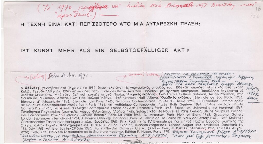 Andreou Kostas (1917 - 2007) ; Fatouros Dimitris (1928 - 2020) ; Spiteri-Veropoulou Ioanna (1920 - 2000) ; Eugène Delacroix (1798 - 1863) ; Giorgos Touyas (1922 - 1994) ; Simossi Gabriela (1926 - 1999) ; Tsoclis Costas (1930) ; Sklavos Yerassimos (1927 - 1967) ; Άγγελος Αγγελόπουλος (1904 - 1995) ; Kontopoulos Alekos (1904 - 1975) ; Mylonas Alex (1923 - 2016) ; Vyzantios Ntikos (1924 - 2007) ; Berto Lardera ; Valsamis Kostas (1908 - 2003) ; Gaitis Yannis (1923 - 1984) ; Le Corbusier (1887 - 1965) ; Georges Mathieu (1921 - 2012) ; Theodoros (Papadimitriou) (1931 - 2018) ; Takis (Vassilakis Panayiotis) (1925 - 2019) ; Victor Vasarely ; Philolaos (Tloupas) (1923 - 2010) ; Kessanlis Nikos (1930 - 2004) ; Kriezi Tita (1930 - 2021) ; Lyberaki Aglaia (1923 - 1985) ; Maltezos Yannis (1915 - 1987) ; Molfesis Iasson (1925 - 2009) ; Paniaras Kostas (1934 - 2014) ; Karras Kostas (1936 - 2012) ; Γιώργος Βαφειάδης