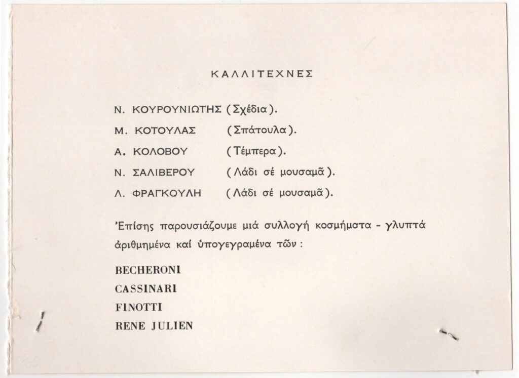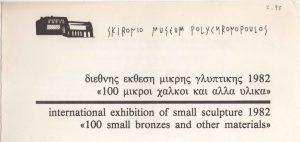 Andreou Kostas (1917 - 2007) ; Κυριάκος Ρόκος (1945) ; Μαρία Λάμπρου ; Luciano Minguzzi ; Tsaras, Kostas (1928 - 1986) ; Chariati-Sismani Katerina (1911 - 1990) ; Chrysochoidou, Titsa (1906 - 1990) ; Μαρία Δωρίτου ; Ikaris Nikolaos (1920 - 1994) ; Kalakallas Giorgos (1938 - 2021) ; Kenneth Mackenzie Clark ; Karympaka-Negreponti Argyro (1929) ; Katapodis, Giorgos (1951) ; Χρυσούλα Αντωνοπούλου ; Ledaki Maria (1932) ; Σταύρος Μπονάτσος (1945) ; Papageorgiou, Dimitris (1928 - 2016) ; Λήδα Παπακωνσταντίνου-Hughes (1945) ; Patsoglou Aristides (1941) ; Αμαλία Βαμβάκου (1925 - 2014) ; Stathopoulos Giorgos (1944) ; Domenico Calabrone (1928 - 2000) ; Κώστας Δομπούλας ; Στάθης Κούρτης ; Elvio Becheroni (1934 - 2000) ; Ευάγγελος Μαρκαντώνης ; Berlini ; Μαρία Βασιλάτου (1936) ; Χαράλαμπος Δαραδήμος ; Βασιλική Γρουσοπούλου-Μαρκούση (1938) ; Τάσος Μουζάκης ; Flip ; Γεράσιμος Καλογηράτος (1940) ; Mascharelli ; Σολομής ; Vulanovic