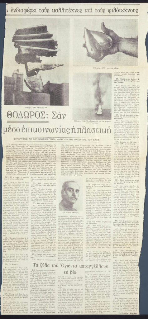 A clipping from the newspaper “Mesimvrini”, dated June 18, 1980, featuring an interview with sculptor Theodoros by N. Petsali-Diomidis, discussing his appointment as a professor in the Department of Sculpture at the National Technical University of Athens.