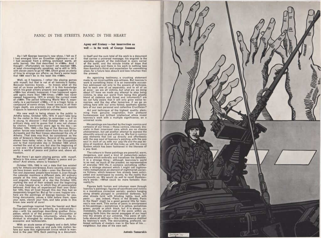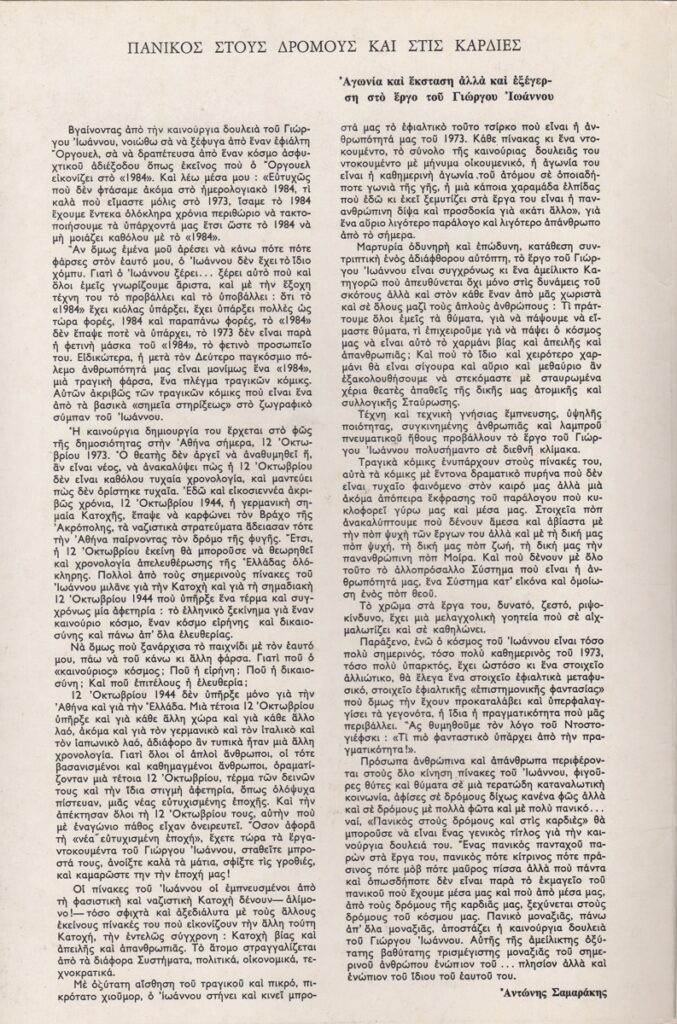 Ioannou Giorgos (1926 - 2017) ; Ioannou Giorgos (1926 - 2017) ; Vassiliou Spyros (1902 - 1985) ; Ioannou Giorgos, fiction writer (1927 - 1985) ; Moralis Yannis (1916 - 2009) ; Spyropoulos Yannis (1912 - 1990) ; Tsarouchis Yannis (1910 - 1989) ; Gaitis Yannis (1923 - 1984) ; Mytaras Dimitris (1934 - 2017) ; Ioannou Olga (20th century) ; Christou Chrysanthos (1922 - 2016) ; Apergis Antonis (1938 - 2018) ; Nikos Nikolaou (1909 - 1986) ; Πέτρος Ζουμπουλάκης (1937) ; Palaiologos Theologou (1930 - 2017) ; Kessanlis Nikos (1930 - 2004) ; Στρατής Μεντάκης ; Prekas Paris (1926 - 1999) ; Brian Hunt ; Απόστολος Πειρουνίδης ; Έπη Νικολακοπούλου ; Ανδρέας Σχοινοχωρίτης ; Xonoglou Dimitris (1949)