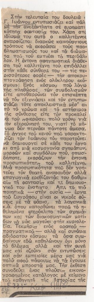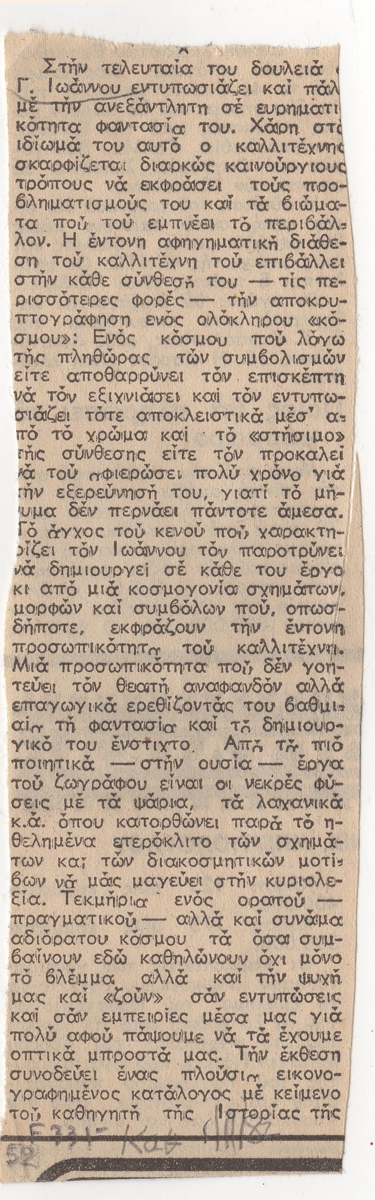 Ioannou Giorgos (1926 - 2017) ; Ioannou Giorgos (1926 - 2017) ; Vassiliou Spyros (1902 - 1985) ; Ioannou Giorgos, fiction writer (1927 - 1985) ; Moralis Yannis (1916 - 2009) ; Spyropoulos Yannis (1912 - 1990) ; Tsarouchis Yannis (1910 - 1989) ; Gaitis Yannis (1923 - 1984) ; Mytaras Dimitris (1934 - 2017) ; Ioannou Olga (20th century) ; Christou Chrysanthos (1922 - 2016) ; Apergis Antonis (1938 - 2018) ; Nikos Nikolaou (1909 - 1986) ; Πέτρος Ζουμπουλάκης (1937) ; Palaiologos Theologou (1930 - 2017) ; Kessanlis Nikos (1930 - 2004) ; Στρατής Μεντάκης ; Prekas Paris (1926 - 1999) ; Brian Hunt ; Απόστολος Πειρουνίδης ; Έπη Νικολακοπούλου ; Ανδρέας Σχοινοχωρίτης ; Xonoglou Dimitris (1949)