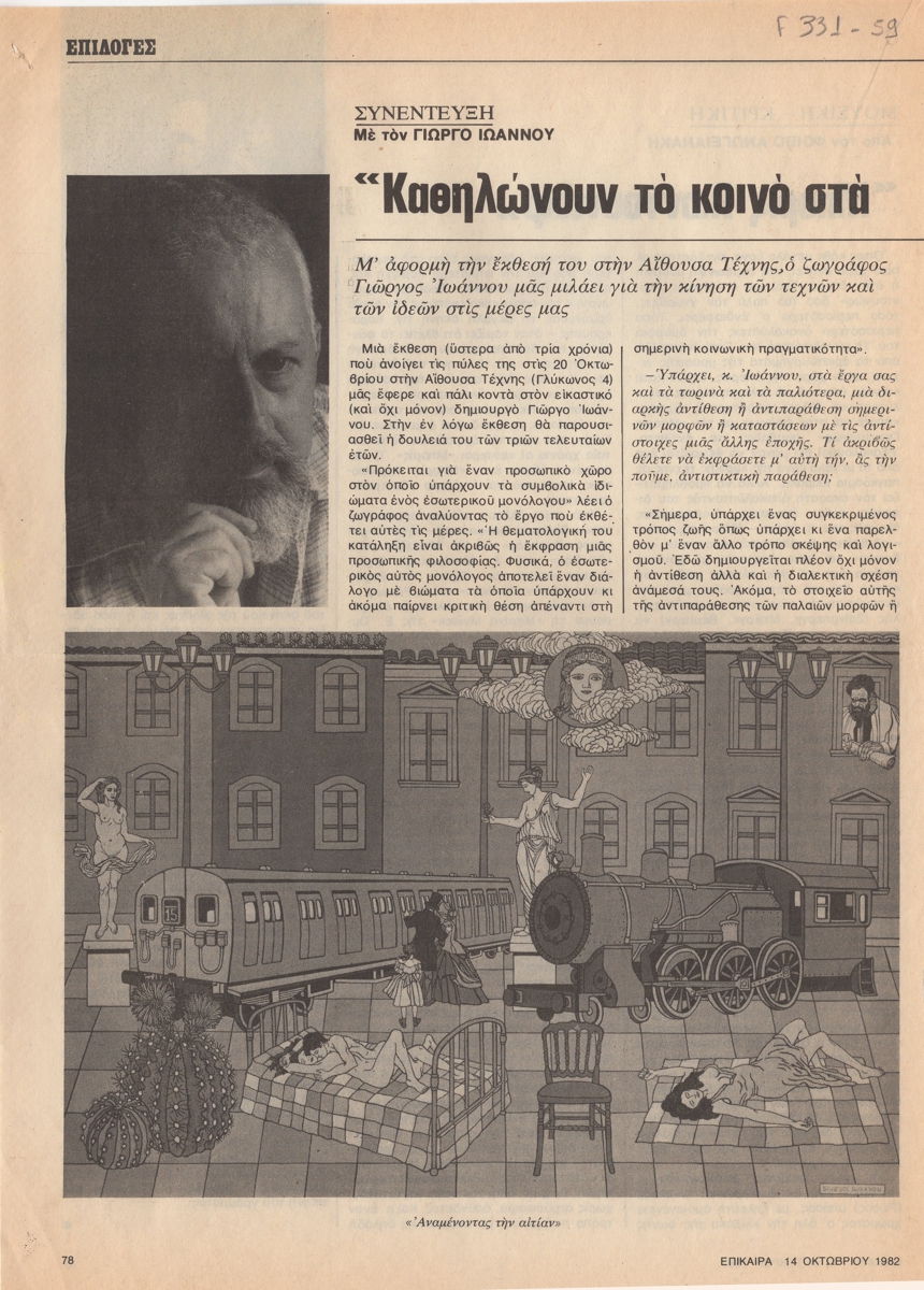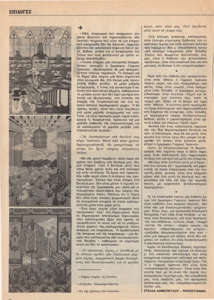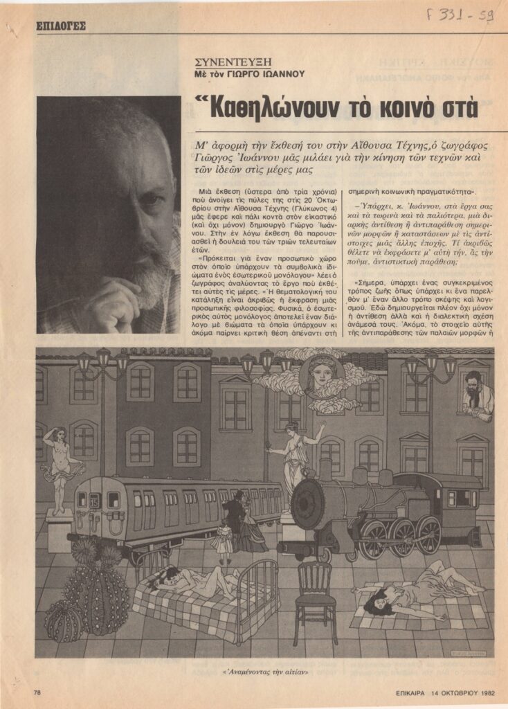 Ioannou Giorgos (1926 - 2017) ; Ioannou Giorgos (1926 - 2017) ; Vassiliou Spyros (1902 - 1985) ; Ioannou Giorgos, fiction writer (1927 - 1985) ; Moralis Yannis (1916 - 2009) ; Spyropoulos Yannis (1912 - 1990) ; Tsarouchis Yannis (1910 - 1989) ; Gaitis Yannis (1923 - 1984) ; Mytaras Dimitris (1934 - 2017) ; Ioannou Olga (20th century) ; Christou Chrysanthos (1922 - 2016) ; Apergis Antonis (1938 - 2018) ; Nikos Nikolaou (1909 - 1986) ; Πέτρος Ζουμπουλάκης (1937) ; Palaiologos Theologou (1930 - 2017) ; Kessanlis Nikos (1930 - 2004) ; Στρατής Μεντάκης ; Prekas Paris (1926 - 1999) ; Brian Hunt ; Απόστολος Πειρουνίδης ; Έπη Νικολακοπούλου ; Ανδρέας Σχοινοχωρίτης ; Xonoglou Dimitris (1949)