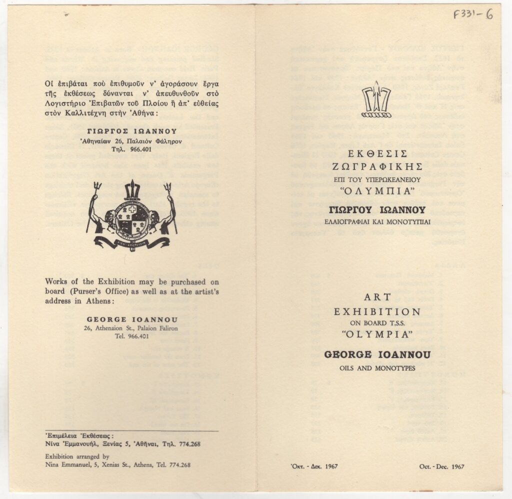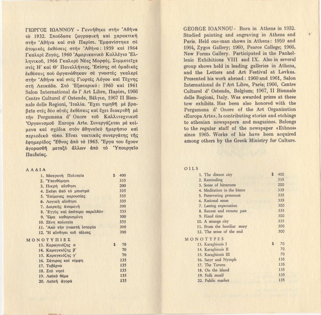 Ioannou Giorgos (1926 - 2017) ; Ioannou Giorgos (1926 - 2017) ; Vassiliou Spyros (1902 - 1985) ; Ioannou Giorgos, fiction writer (1927 - 1985) ; Moralis Yannis (1916 - 2009) ; Spyropoulos Yannis (1912 - 1990) ; Tsarouchis Yannis (1910 - 1989) ; Gaitis Yannis (1923 - 1984) ; Mytaras Dimitris (1934 - 2017) ; Ioannou Olga (20th century) ; Christou Chrysanthos (1922 - 2016) ; Apergis Antonis (1938 - 2018) ; Nikos Nikolaou (1909 - 1986) ; Πέτρος Ζουμπουλάκης (1937) ; Palaiologos Theologou (1930 - 2017) ; Kessanlis Nikos (1930 - 2004) ; Στρατής Μεντάκης ; Prekas Paris (1926 - 1999) ; Brian Hunt ; Απόστολος Πειρουνίδης ; Έπη Νικολακοπούλου ; Ανδρέας Σχοινοχωρίτης ; Xonoglou Dimitris (1949)