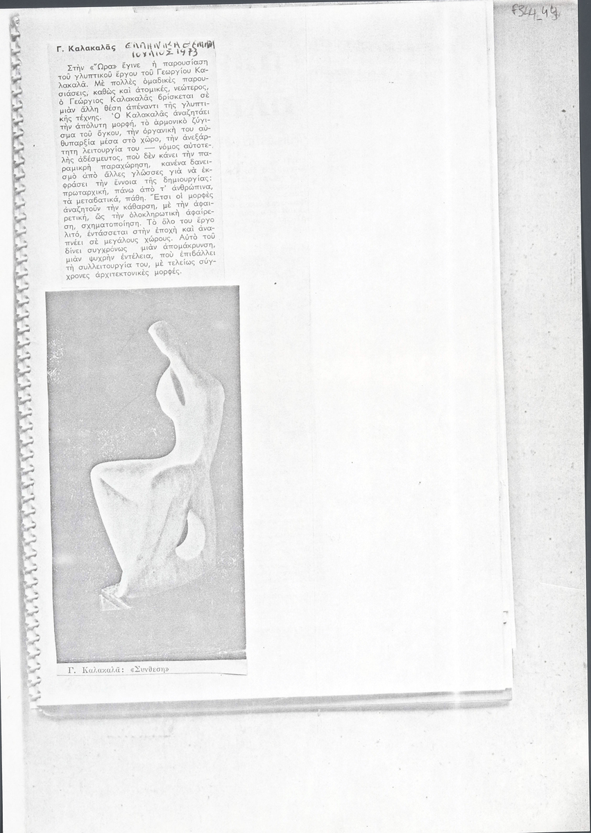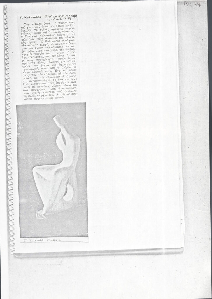 Photocopy of a clipping from the periodical “Hellenika Themata” (issue, 07/1973), featuring a review of the solo sculpture exhibition by Giorgos Kalakalla in Athens.