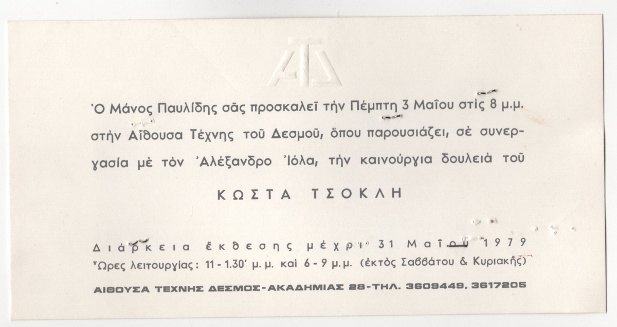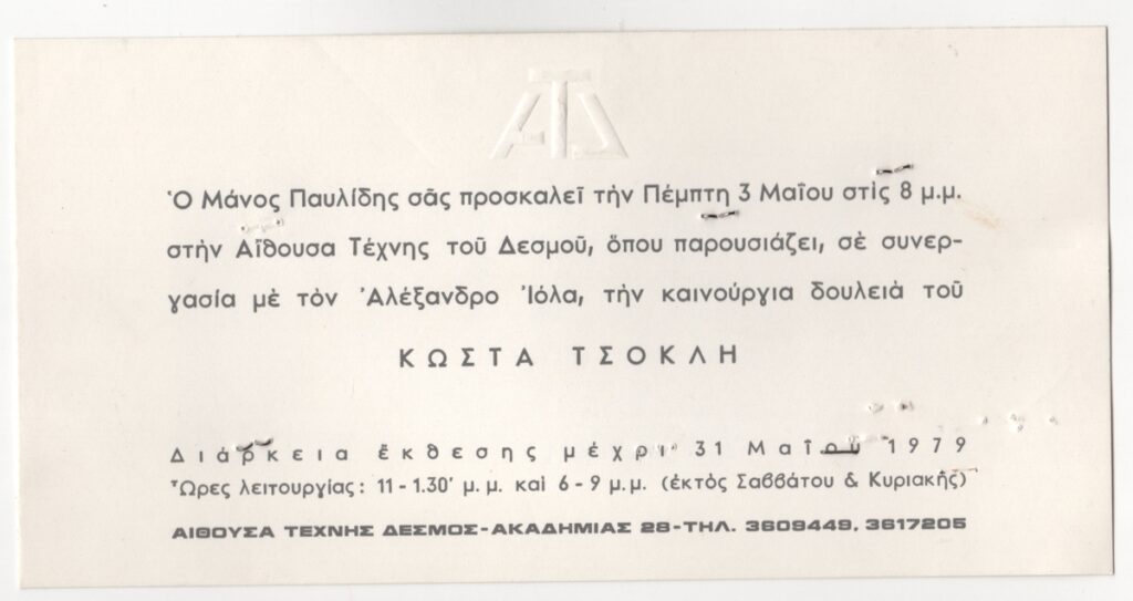 Spiteris Tonis (1910 - 1986) ; Katraki Vaso (1914 - 1988) ; Spiteri-Veropoulou Ioanna (1920 - 2000) ; José Pierre ; Michalis Katzourakis ; Fassianos Alekos (1935 - 2022) ; Simossi Gabriela (1926 - 1999) ; Tsoclis Costas (1930) ; Opy Zouni (1941 - 2008) ; Gaitis Yannis (1923 - 1984) ; Mytaras Dimitris (1934 - 2017) ; Karas Christos (1930 - 2023) ; Denis Schneider ; Vernadaki Eleni (1933) ; Takis (Vassilakis Panayiotis) (1925 - 2019) ; Sperantzas Vassilis (1938) ; Alexis Akrithakis (1939 - 1994) ; Achilleas Droungas (1940) ; Theofylaktopoulos Makis (1939 - 2023) ; Kaniaris Vlassis (1928 - 2011) ; Karavouzis Sarantis (1938 - 2011) ; Θεόδωρος Μανωλίδης (1940)