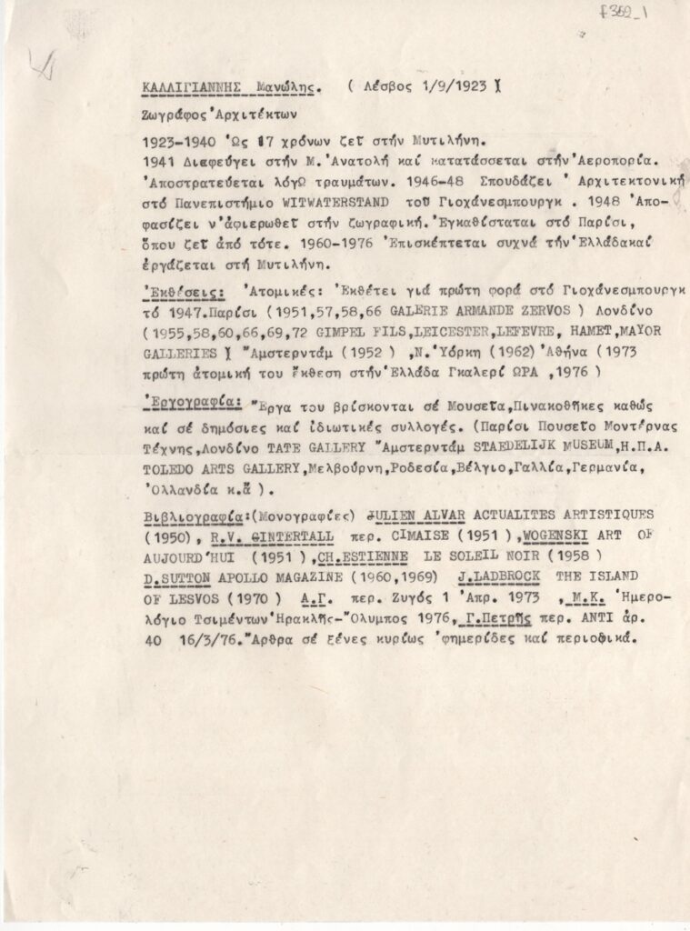 Spiteri-Veropoulou Ioanna (1920 - 2000) ; Vafeiadis Markos (1906 - 1992) ; Raftopoulou Bella (1902 - 1992) ; Pavlos (Dionyssopoulos) (1930 - 2019) ; Christoforou John (1921 - 2014) ; Fassianos Alekos (1935 - 2022) ; Μανώλης Καλλιγιάννης ; Simossi Gabriela (1926 - 1999) ; Tsarouchis Yannis (1910 - 1989) ; Tsoclis Costas (1930) ; (Panagopoulos) Daniel (1924 - 2008) ; Koulentianos Kostas (1918 - 1995) ; Vyzantios Ntikos (1924 - 2007) ; Tzolaki Rena (1930) ; Angelopoulos Aristomenis (1900 - 1990) ; Philolaos (Tloupas) (1923 - 2010) ; Fokas Yannis (1951) ; Κώστας Χαραλαμπίδης (1946) ; Pierrakos Alkis (1920 - 2017) ; Sperantzas Vassilis (1938) ; Karavouzis Sarantis (1938 - 2011) ; Yulika Lakeridou (1940) ; Kindynis Anna (1914 - 2003) ; Kriezi Tita (1930 - 2021) ; Lyberaki Aglaia (1923 - 1985) ; Κώστας Μακρής ; Maltezos Yannis (1915 - 1987) ; Molfesis Iasson (1925 - 2009) ; Κωνσταντίνος Μόραλης ; Bouteas Yannis (1941 - 2026) ; Xenakis Constantinos (1931 - 2020) ; Pastra Nausica (1921 - 2011) ; Gisele Πράσινου ; Tsekoura, Vassiliki (1947) ; Πάνος Ελευθερίου ; Δημήτρης Ράτσικας (1946) ; Νίκος Δαμιανάκης (1920 - 2005) ; Pantelias Miltos (1954) ; Νίκος Τσιώτης ; Εριέττα Βορδώνη (1959) ; Κωνσταντίνος Γιαννικούρης