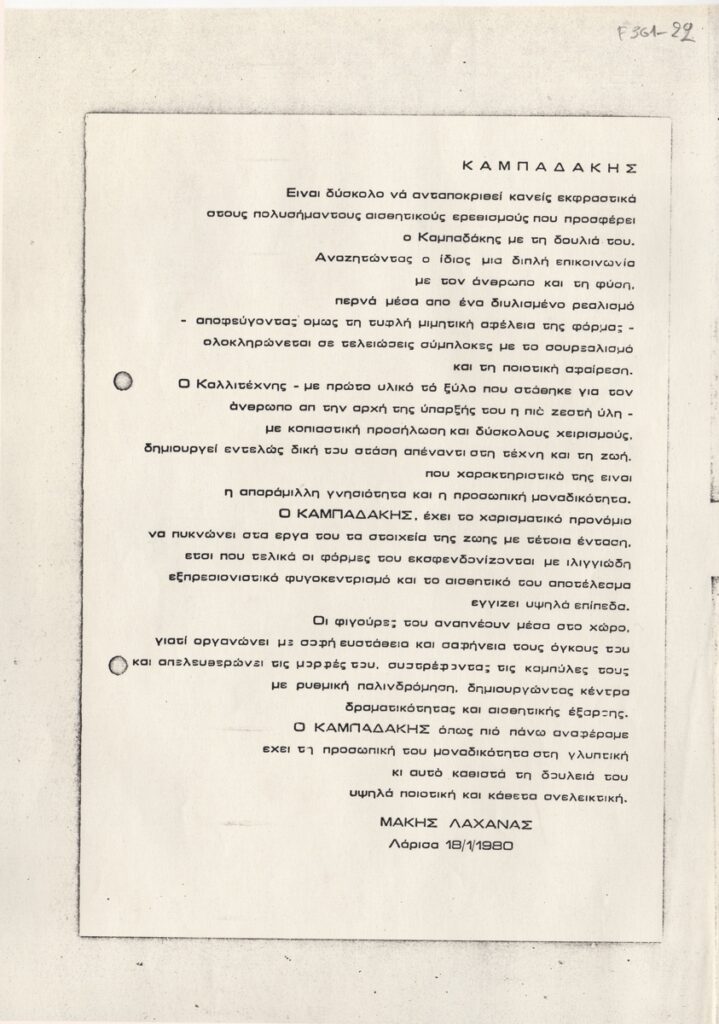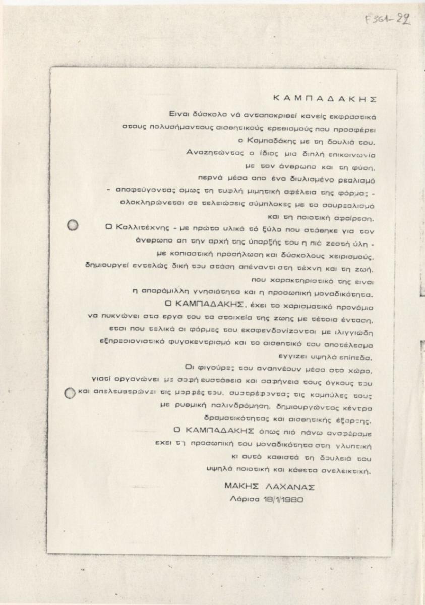 Xanthippos Vissios (1947 - 2021) ; Nikos Gavriil Pentzikis (1908 - 1993) ; Isaris Alexandros (1941 - 2022) ; Takis Iatrou (1921 - 1998) ; Μάκης Λαχανάς (1924 - 2010) ; Giorgos Lazogkas (1945 - 2022) ; Logothetis Stathis (1925 - 1997) ; Stelios Mavromatis (1930 - 2020) ; Paralis Giorgos (1908 - 1975) ; Nikos Paralis (1941 - 1995) ; Eleine Ask ; Sotiris Zisis (1902 - 1989) ; Karel Čízek (1922 - 2013) ; Konstantinos Trakidis (1921 - 2011) ; Δημήτριος Καζάκης ; Andreas Zampetoglou (1936 - 2006) ; Zoglopitis Fonis (1930 - 2015) ; Panos-Ioannis Papanakos (1930 - 1999) ; Billie Goussiou (1937 - 1998) ; Κλείτος Κύρου